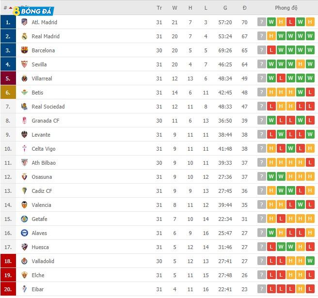 Real Madrid cũng bị Atletico Madrid nới rộng cách biệt với ngôi đầu trong cuộc đua vô địch lên thành 3 điểm. Thầy trò HLV Diego Simeone có 70 điểm sau 31 vòng đấu với chiến thắng 5-0 trước Eibar.