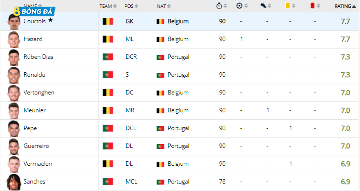 10 cầu thủ Bỉ vs Bồ Đào Nha chấm điểm cao nhất theo 8bongtv