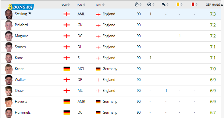 Top 10 cầu thủ được chấm điểm cao nhất Anh vs Đức