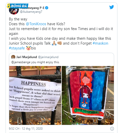 Aubameyang đã lên twitter để trả lời tuyển thủ Đức và nói “Chỉ cần nhớ rằng tôi đã làm điều đó [lễ kỷ niệm] cho con trai tôi một vài lần và tôi sẽ làm lại.”