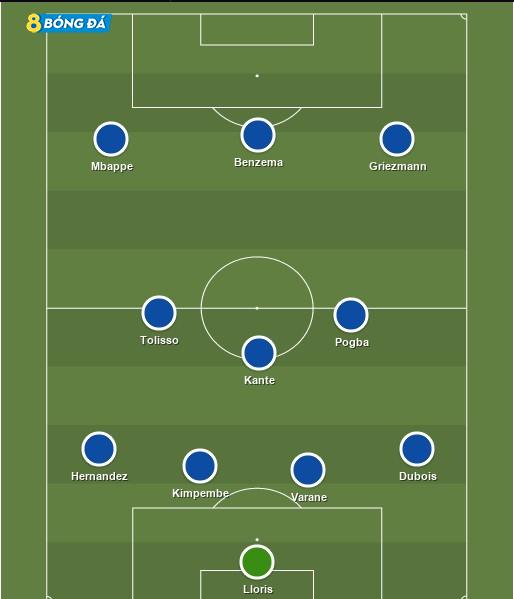 Hugo Lloris sẽ xuất phát trong khung thành, với Dubois cùng Raphael Varane, Presnel Kimpembe và Lucas Hernandes ở tuyến sau.