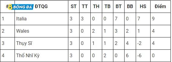 Như vậy, Italia và xứ Wales là 2 ĐTQG có vé vào thẳng vòng 1/8 EURO năm nay với tư cách đội nhất và đội nhì bảng A. Thụy Sĩ (4 điểm và hiệu số bàn thắng – thua là -1) sẽ phải nín thở chờ xem liệu mình có lọt vào top 4/6 đội đứng thứ 3 có thành tích tốt nhất vòng bảng để đi tiếp hay không.