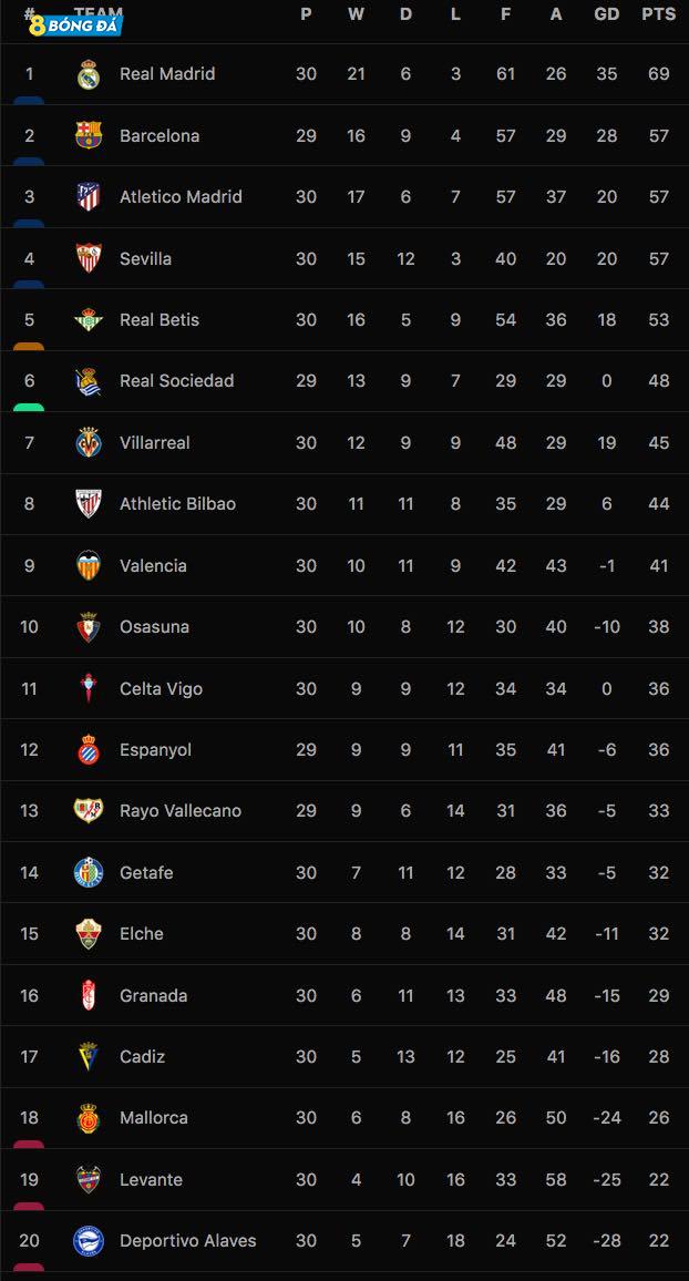 Với lợi thế 12 điểm có nghĩa là điều đó chắc chắn không thể xảy ra lúc này nhưng Barca đang ở vị trí dẫn đầu để về nhì, đây sẽ là một thành tích đáng kể đối với một đội mà chỉ vài tháng trước còn lo ngại về việc bỏ lỡ tốp 4. Khi Xavi tiếp quản vào tháng 11, họ đứng thứ chín.