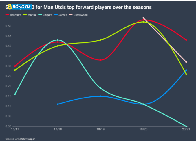 Ngay cả Mason Greenwood , người được coi là tia sáng chói lọi trên hàng công của Man Utd, cũng chứng kiến số bàn thắng của chính anh giảm từ 0,54 bàn / 90 trận ở mùa giải 2019/20 xuống chỉ còn 0,32 ở mùa giải trước.