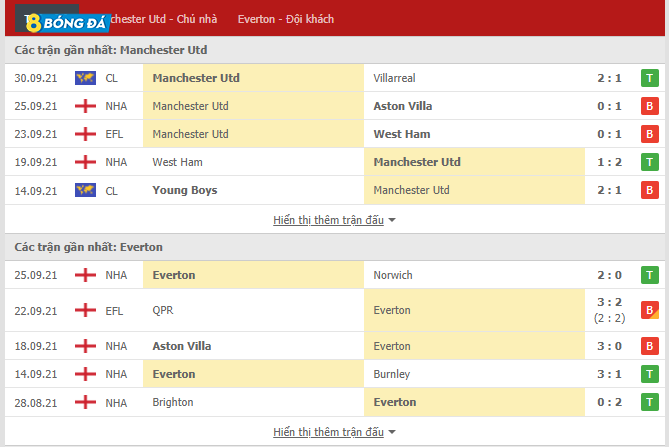 Phong độ gần đây của MU vs Everton